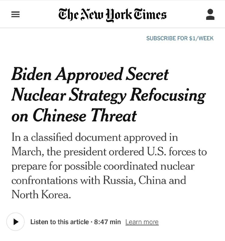🇺🇸⚡️The New York Times: Biden in March endorsed a classified U.S. nuclear strategy that for the first time outlines a plan to contain China as its nuclear arsenal grows and to prepare for coordinated challenges from Beijing, Pyongyang and Moscow.…