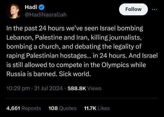 🇮🇱In the last 24 hours, we have seen Israel attack Lebanon, Palestine and Iran, kill journalists, bomb a church and debate the legality of raping Palestinian hostages. Russia is banned from the Olympics, but Israel is allowed in. This world…