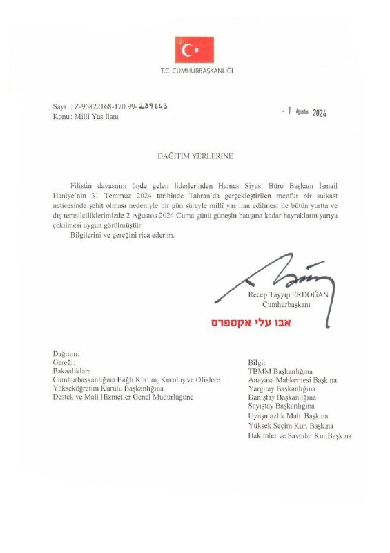 🇹🇷The President of Turkey, Erdogan, announced that tomorrow there will be an official day of mourning in Turkey due to the death of Ismail Haniya and as a sign of support for the Palestinians. View Source