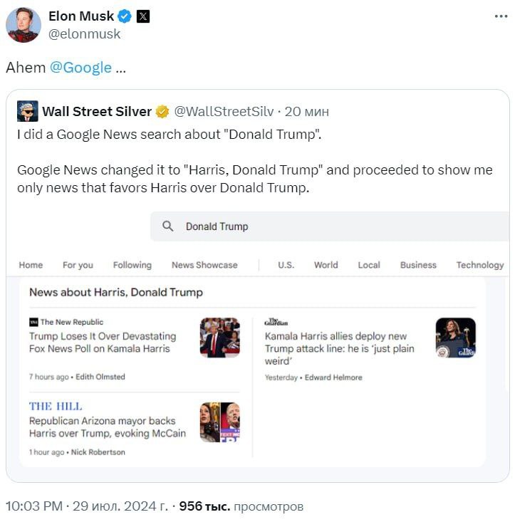 🇺🇸Elon Musk suggested that Google is interfering in the US presidential election. Musk claims that the search engine blocks queries about Donald Trump or accompanies them with a significant amount of information about the likely Democratic candidate Kamala Harris The…