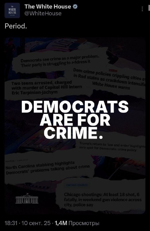 🇺🇸The White House accused the US Democratic Party of supporting crime after the murder of Trump supporter Charlie Kirk. “Democrats are for crime,” the administration’s account states. View Source