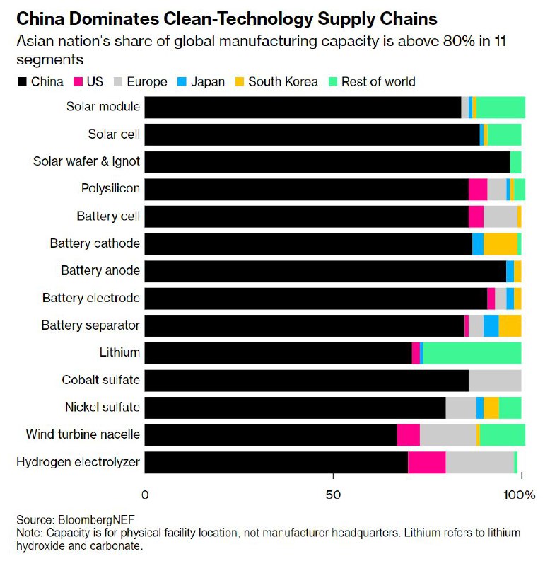 🇨🇳 – China’s share of global production capacity is now above 80% for 11 clean technologies • Massive Chinese investments mean that China’s clean tech rise may not be over • Beijing also invested US$546bn in its own energy transition in 2022, around half of global financing
