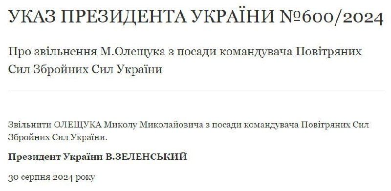 🇺🇦❗️Commander of the Air Force of the Armed Forces of Ukraine Mykola Oleshchuk was removed from his post by decree of Zelensky.