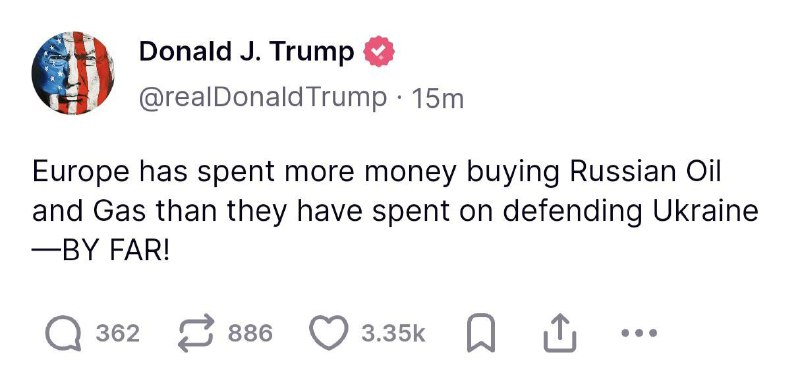 🇺🇸🇪🇺❗️ Europe spent more money buying Russian oil and gas than it did defending Ukraine – way more ! – Trump View Source
