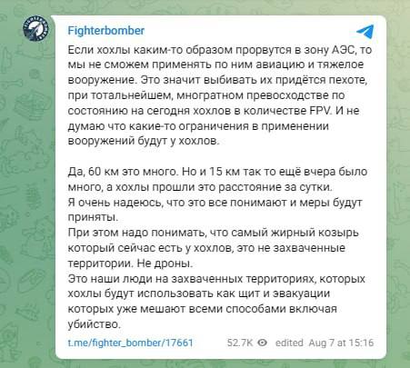 “If the Ukrainians manage to breach the area around the nuclear power plant, the use of aviation and heavy weapons will be restricted, requiring infantry to dislodge them despite Ukraine’s significant advantage in FPV drones. The rapid advance of 15 km in a day highlights the urgency of the situation. The main concern is not just the occupied territories or drones, but the local population, who could be used as human shields by the Ukrainians and whose evacuation is being hindered, even by lethal means,” he summarizes, a little worried.