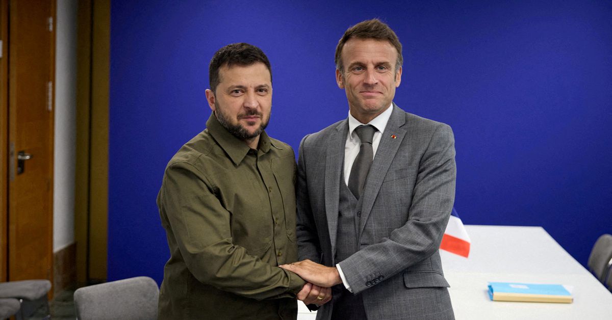 Ukraine’s President Volodymyr Zelenskiy and French President Emmanuel Macron pose for a picture during a meeting on the sidelines of the European Political Community Summit in Granada, Spain October 5, 2023. Ukrainian Presidential Press Service/Handout via REUTERS/File Photo Acquire Licensing Rights