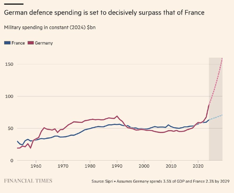 🇩🇪⚡️— Germany’s defense spending is set to decisively surpass France’s, potentially reaching nearly double by 2029, per FT. 🇪🇺 Legion Europa | Group Chat 🇪🇺 View Source