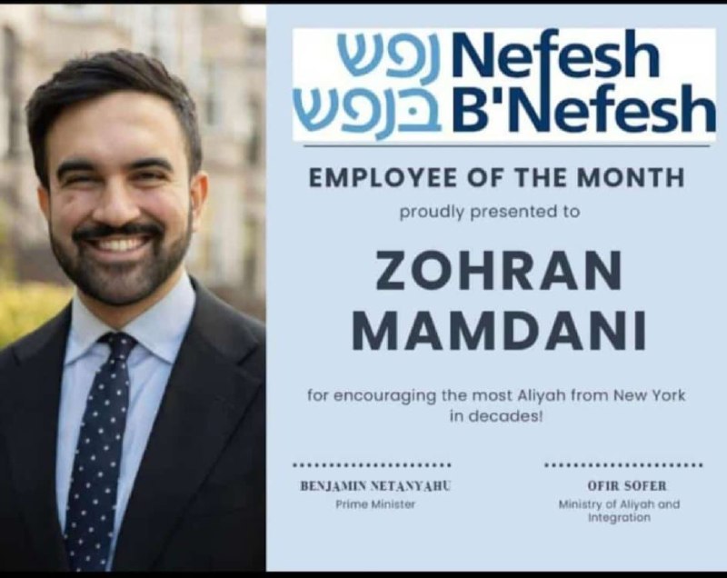 🇮🇱✈️ GOING VIRAL: A meme circulating across Jewish and Israeli social media this week reflects a sense of unease and anxious humor following the election of Zohran Mamdani as New York’s next mayor. The meme depicts him as “Employee of the Month” for Nefesh B’Nefesh — suggesting that, in the wake of his victory, many Jewish New Yorkers are now seriously considering Aliyah to Israel.