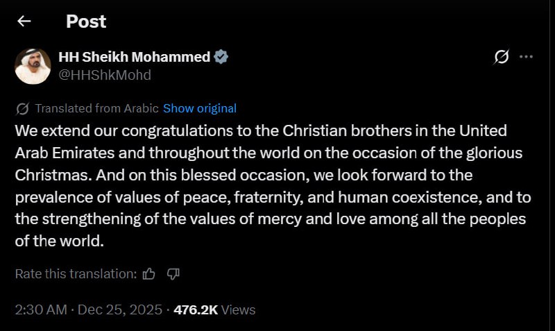 🇦🇪🤝✝️ — His Royal Highness Sheikh Mohammed bin Rashid Al Maktoum wishes all Christians, in UAE and abroad, a Merry Christmas: