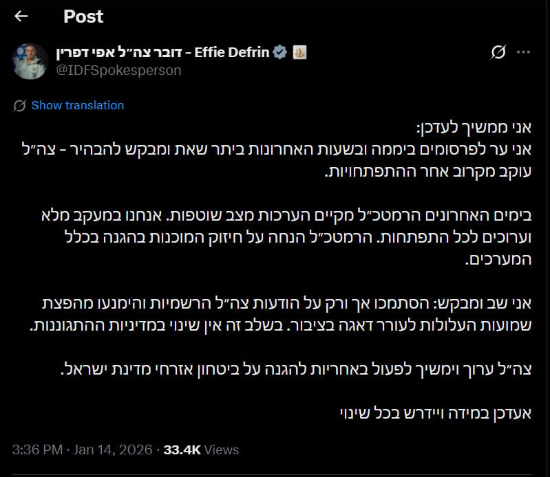 I reiterate my request: Rely solely on official IDF announcements and avoid spreading rumors that may cause concern in the public. At this stage, there is no change in the defense policy.