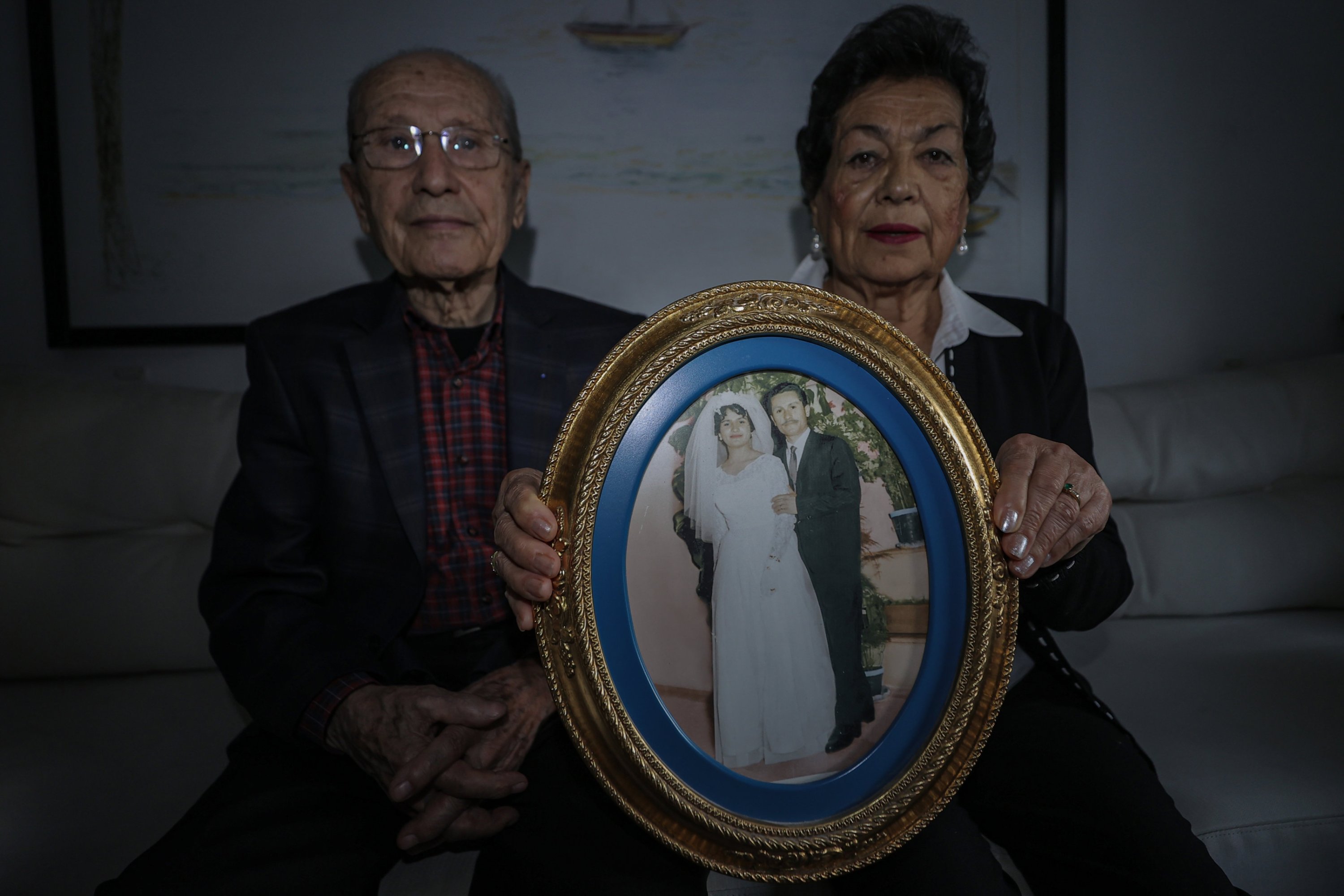Arif and Türkan Kaner display their wedding photo from six decades ago at their home in Bursa, western Türkiye, Nov. 25, 2025. (AA Photo)