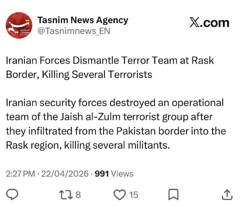🚨🇮🇷❌🇵🇰 – Iran’s IRGC-linked Tasnim News Agency reports that Iranian forces killed several militants belonging to Jaish al-Adl, claiming they “infiltrated from the Pakistan border into” Iran.