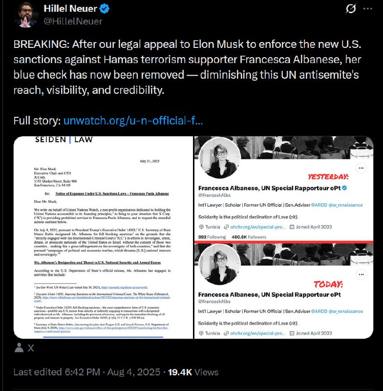 🇮🇱🤝📱 Israel pressured X/Twitter to remove the blue checkmark from the U.N. Special Rapporteur on the occupied Palestinian territories, Francesca Albanese.