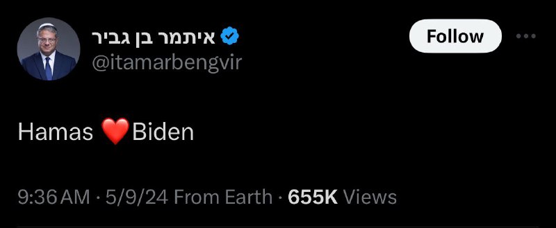 Israeli Minister of National Security, Itamar Ben-Gvir, tweets in English: ”Hamas ❤️ Biden” TELEGRAM 🔗 https://t.me/JewishBreakingNewsTelegram WHATSAPP GROUP 🔗 https://whatsapp.com/channel/0029Va4EEJU7YSdAqzGs362F INSTAGRAM 🔗 http://bit.ly/JewishBreakingNews_IG STATUS 🔗 https://wa.me/message/2BHKFPEVQP3FK1 View Source