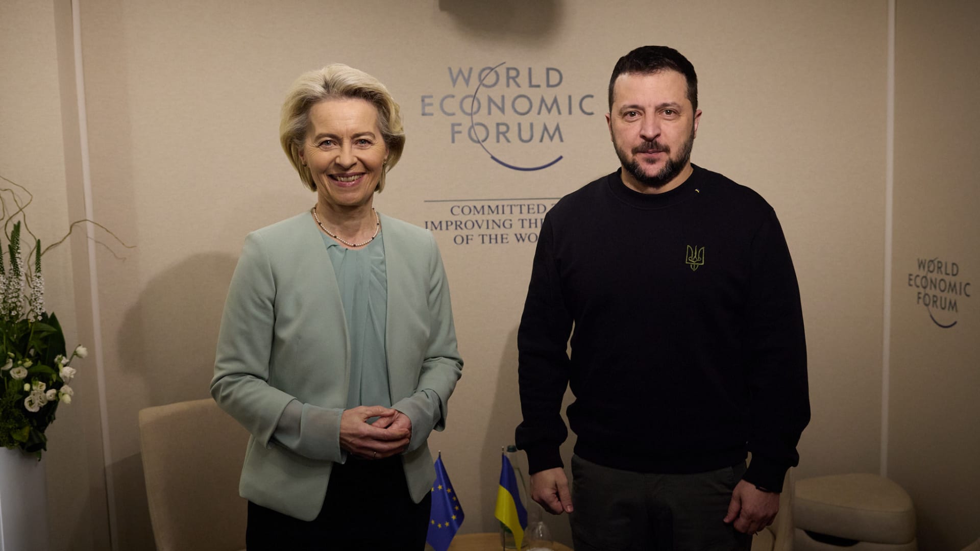 Ukrainian President Volodymyr Zelenskyy (R) meets with President of EU Comission Ursula von der Leyen (R) during a bilateral meeting as part of the annual meeting of the World Economic Forum in Davos, Switerland on January 16, 2024.
