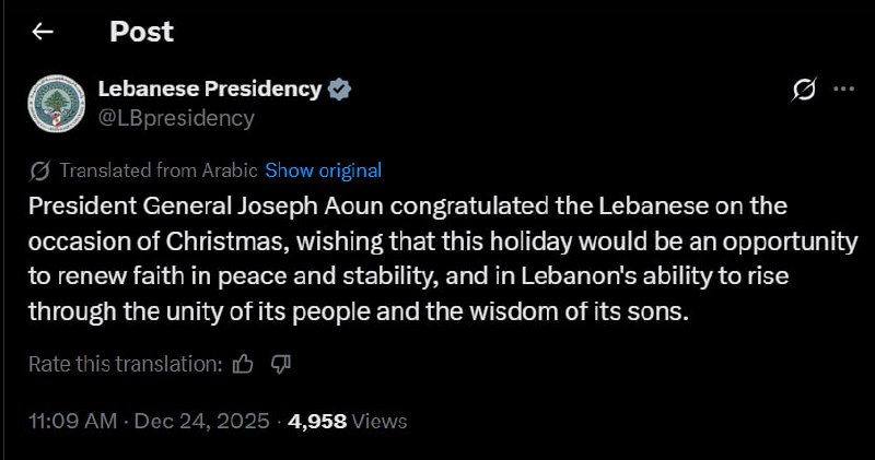 🇱🇧🤝✝️ — Lebanese President Joseph Aoun, a Maronite Christina, wishes all the Lebanese a Merry Christmas!: