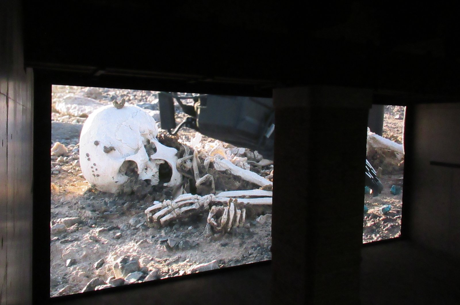 Visitors stand in front of the work “Camata” by Pierre Huyghe in the Punta della Dogana Museum. “Camata” shows a human skeleton around which robotic arms perform a kind of bizarre burial ritual. For the show, the French documenta artist travelled to the Atacama Desert to visit a skeleton that is around 100 years old. (dpa Photo)