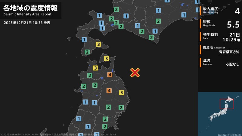 ➡️ The depth of the hypocenter is approximately 50 km, the magnitude is M5.5, and the maximum seismic intensity of 4 was observed in Aomori Prefecture and Iwate Prefecture.
