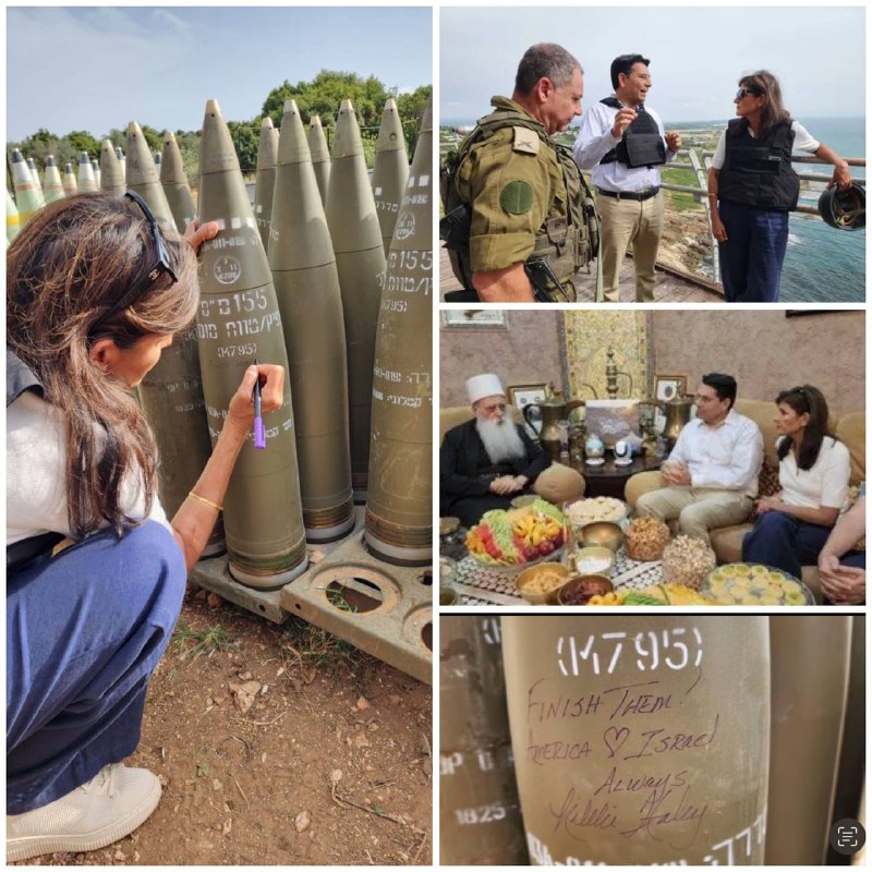 🇺🇸🇮🇱 Nikki Haley signed an Israeli artillery shell on the border with Lebanon and wrote on it: Finish them! She served as the US ambassador to the UN under former President Donald Trump. 🚩 @ResistanceTrench View Source