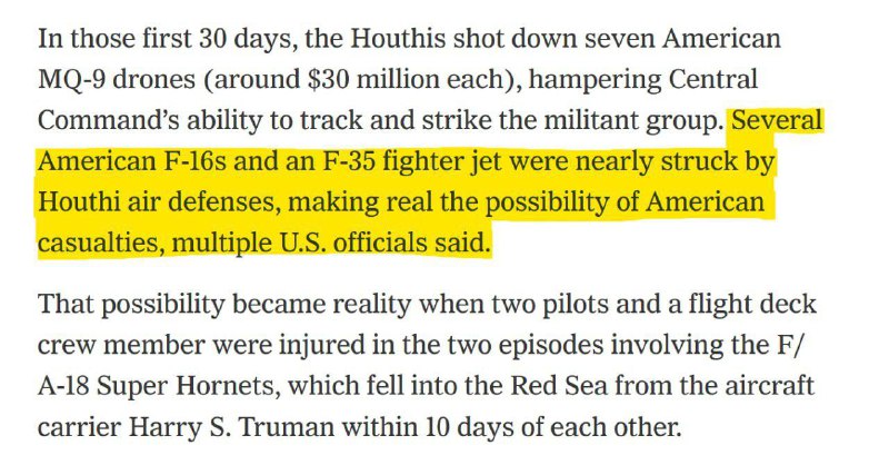 🚨🇺🇸🇾🇪 NYT: Several American F-16s and an F-35 fighter jet were nearly struck by Houthi air defenses In an explosive report, the New York Times has revealed President Trump ordered the end of the Anti-Houthi campaign as a result of their increasing capacity…