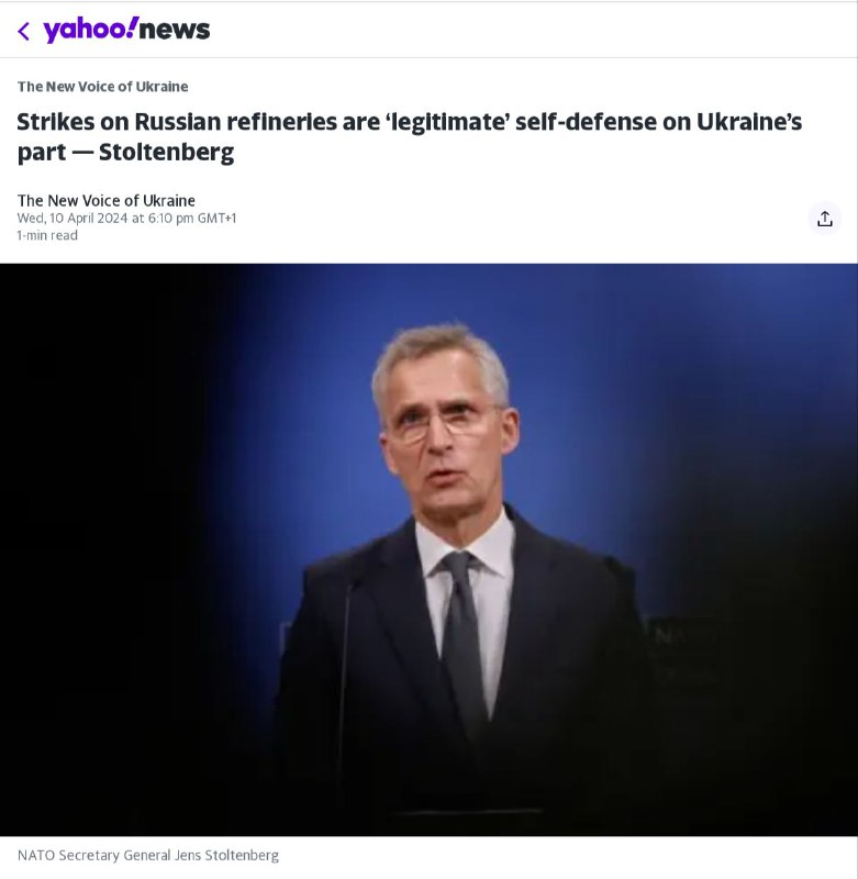 Oil refineries in Russian territory are “legitimate” targets for Ukrainian drone strikes, NATO Secretary General Jens Stoltenberg stated, during a joint press briefing with Finnish President Alexander Stubb on April 10.