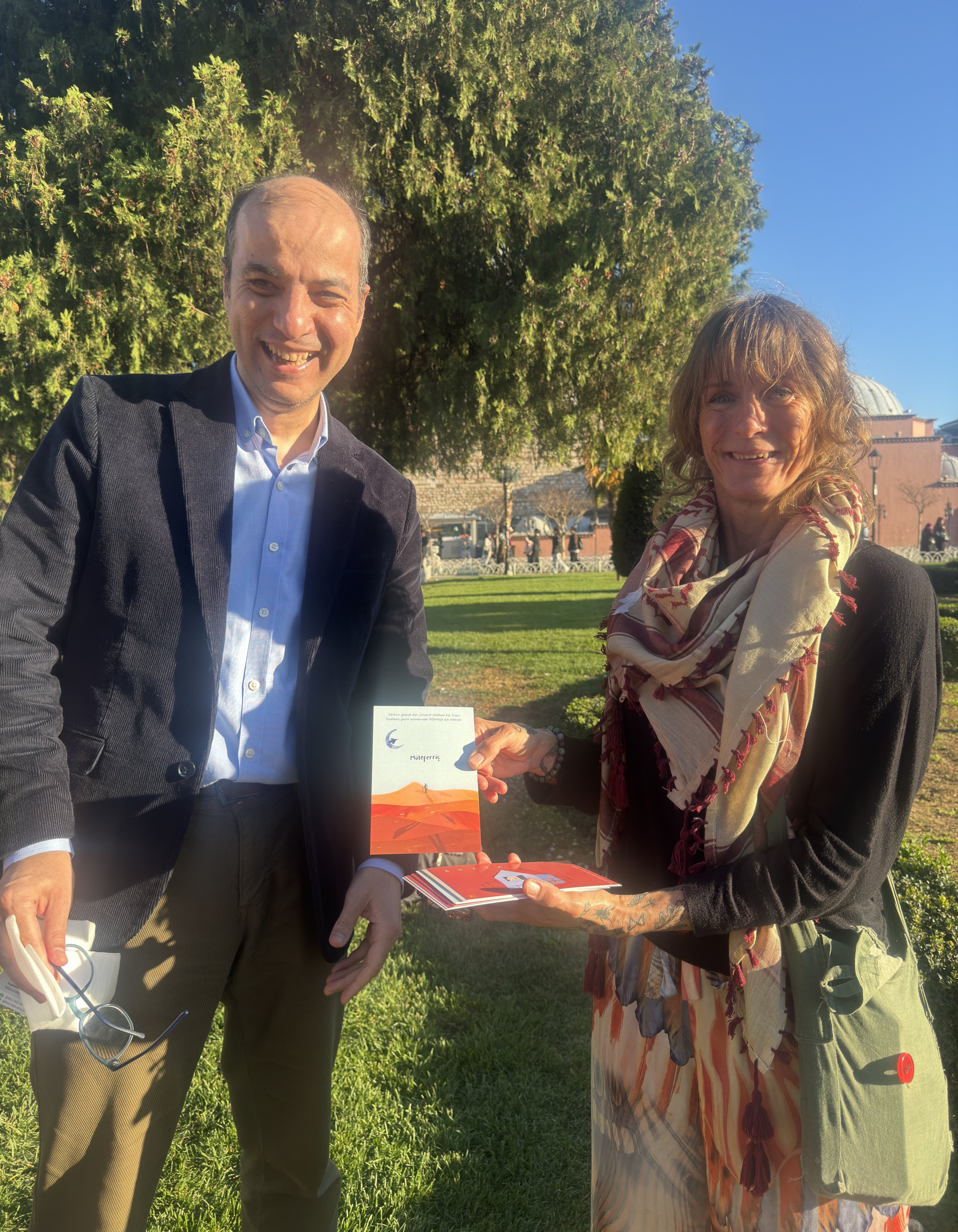 The final stop of the day unfolded in Sultanahmet, after a visit to Cağaloğlu’s newly revived Book Bazaar, where independent publishers are returning to their historical neighborhood. Near the Turkish and Islamic Arts Museum, another form of testimony appeared. Ruth Herbert, a volunteer who walked from the United Kingdom to Türkiye to raise awareness and medical aid for Palestine, had just completed her monthslong journey. She received a postcard referencing the idea of the müteferriç, a term describing someone who “releases or eases a burden through movement.” Her arrival added a human, physical dimension to a day framed largely by exhibitions and images, reminding visitors that solidarity can take shape not only through representation but through sustained action.