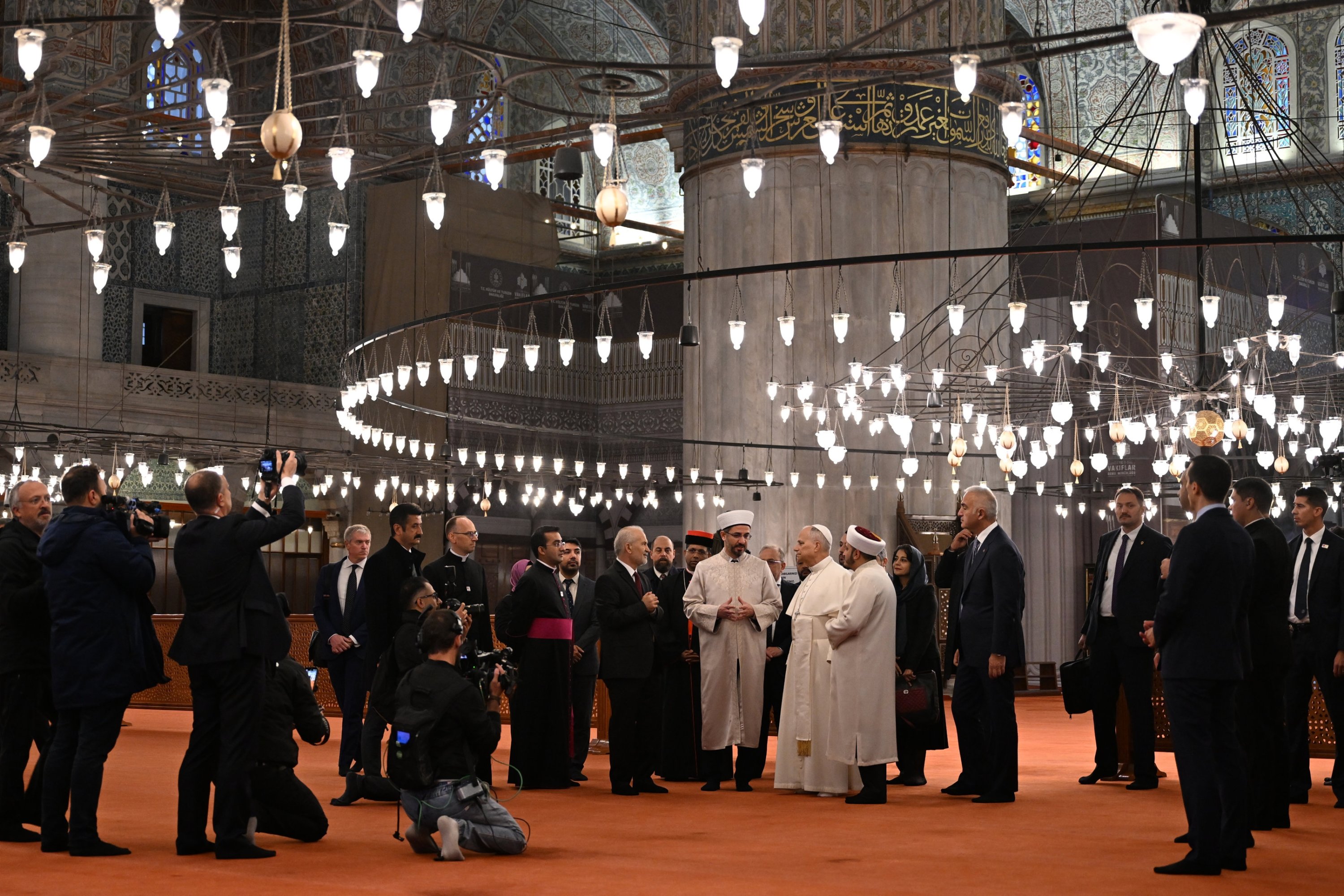 Pope Leo XIV (C) visits the Sultan Ahmed Mosque, commonly known as the Blue Mosque, Istanbul, Türkiye, Nov. 29, 2025. (EPA Photo)