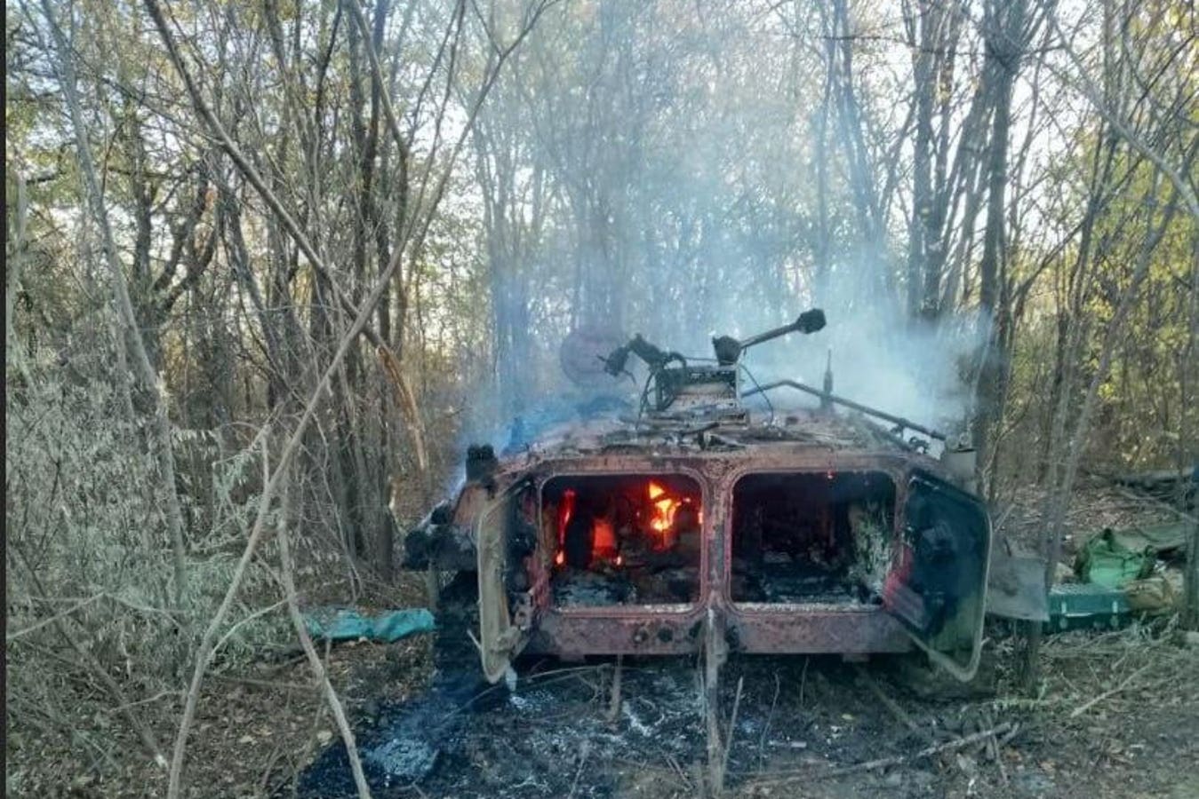 A Russian MT-LB, fitted with an RP-377 jammer, burns.