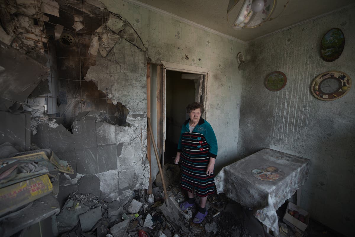 A woman stands among the rubble in her damaged apartment hit by recent shelling, what local officials called a Ukrainian military strike, in Donetsk, Russian-controlled Ukraine