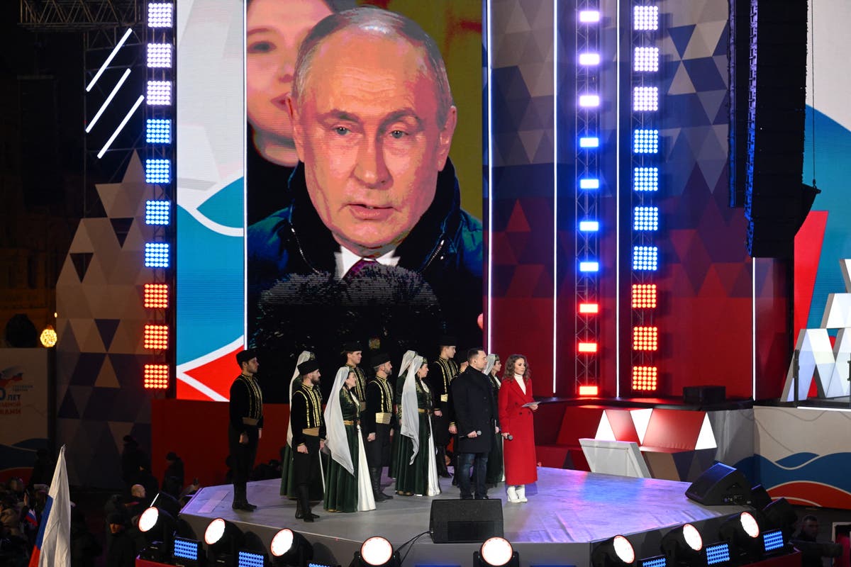 Mr Putin addressed thousands of people in Moscow at a concert to mark the 10th anniversary of the annexation of Crimea from Ukraine. His three token opposition candidates appeared on stage beside him and publicly supported him.