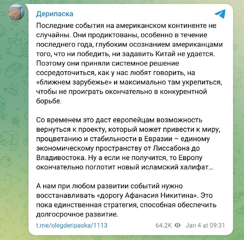 “The recent events in the American continent are not accidental. They are dictated, especially over the past year, by a deep realization by Americans that they cannot either defeat or suppress China. Therefore, they have made a systematic decision to focus, as we like to say, on the ‘near abroad’ and strengthen their positions there as much as possible, so as not to lose out completely in the competitive struggle,” writes Deripaska.