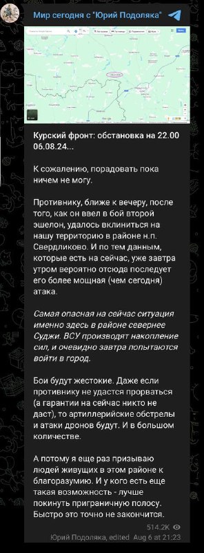 As of 22:00, the situation on the Kursk front is dire. The enemy has penetrated into the Sverdlikovo area and is expected to launch a stronger attack tomorrow morning. The most dangerous situation is north of Sudzha, where Ukrainian forces are amassing and likely to attempt to enter the city. Intense fighting, artillery shelling, and drone attacks are expected. Residents in the area are urged to evacuate if possible, as the conflict will not end quickly.