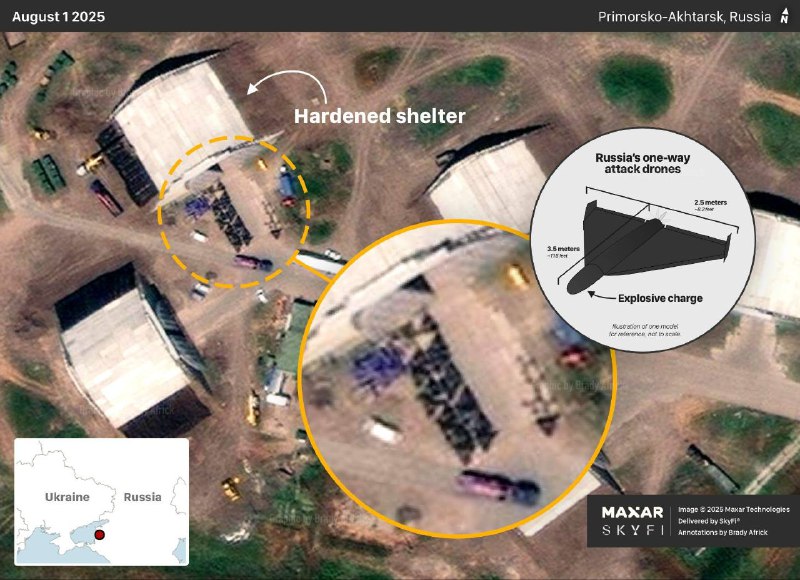 🇷🇺🇺🇦Satellite images of the Primorsko-Akhtarsk airfield published by a Western analyst, from which the kamikaze drones “Geran-2” are launched.
