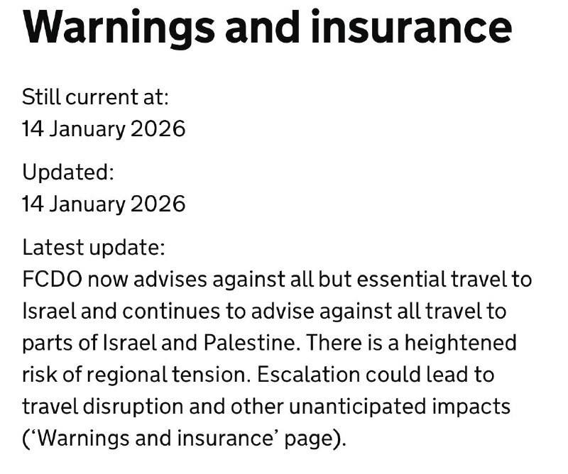 🇬🇧❌🇮🇱 — The British Foreign Office advises its citizens to avoid all non-essential travel to Israel: “There is a heightened risk of regional tensions. Escalation could lead to travel disruption and other unanticipated impacts”. View Source