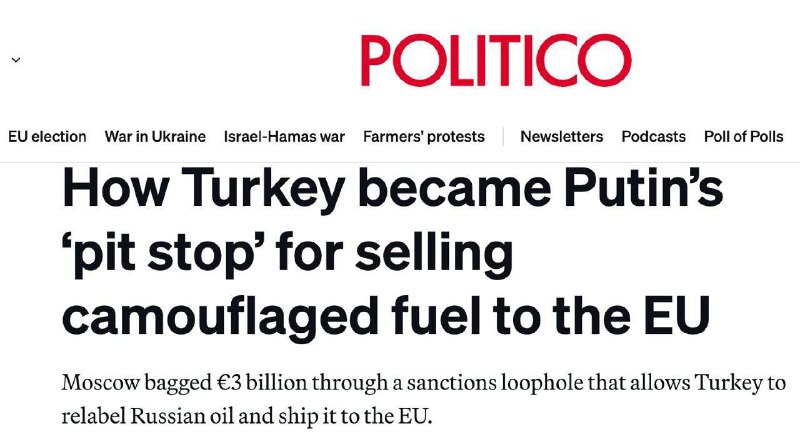 🇷🇺🇪🇺 The European Union is massively importing Russian oil, hidden under other markings, through Turkey, Politico reports.