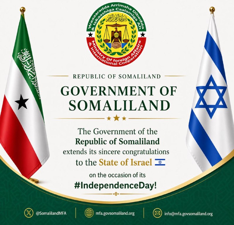 🏳️📞🇮🇱❗️🌹 — The Government of the Republic of Somaliland extends its sincere and warmest congratulations to the State of Israel on the occasion of its Independence Day.