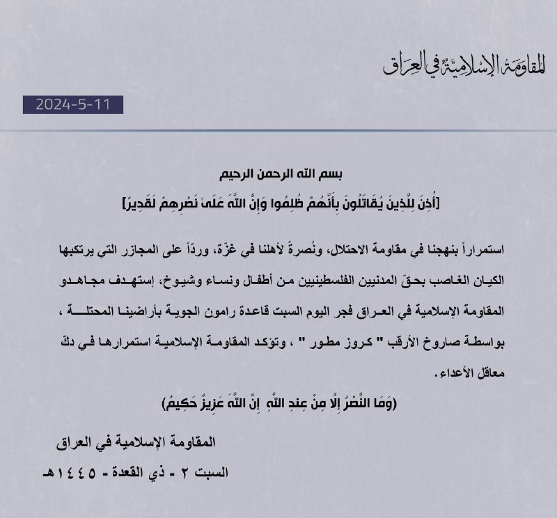 🔴🇮🇶⚡️💤🔻The Islamic Resistance in Iraq: ― The Mujahideen of the Islamic Resistance in Iraq targeted, at dawn on Saturday, the Ramon Air Base in our occupied territories, using the Arqab “developed cruise” missile, and the Islamic Resistance confirms its continued destruction of enemy strongholds.