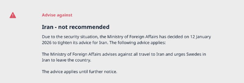 🇸🇪📞🇮🇷❗️ — The Kingdom of Sweden has updated its travel advice for Iran, saying that “In view of the security situation, the Ministry for Foreign Affairs advises against all travel to Iran and urges Swedes in Iran to leave the country” https://www.swedenabroad.se/sv/om-utlandet-f%C3%B6r-svenska-medborgare/iran/🔗 Faytuks News (@Faytuks) View Source