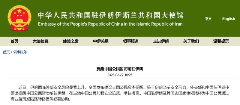 🇨🇳📞🇮🇷 — The Mainland Chinese Embassy in Iran urges citizens to leave Iran ‘as soon as possible’ View Source
