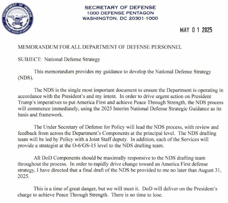🇺🇸The Pentagon has begun developing a new national defense strategy for the United States.