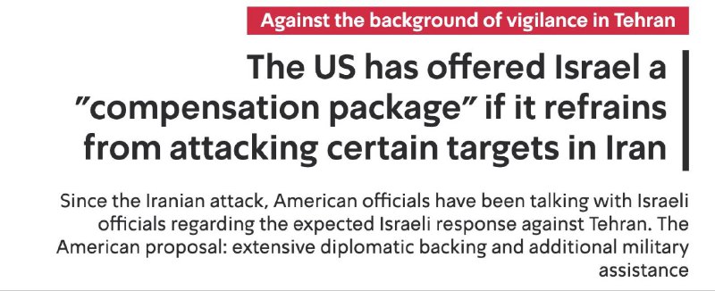 🇺🇸🇮🇱🇮🇷The US has offered Israel a “compensation package” consisting of extensive diplomatic backing and additional military assistance if it refrains from attacking certain targets in Iran, according to Israel’s Kann News View Source