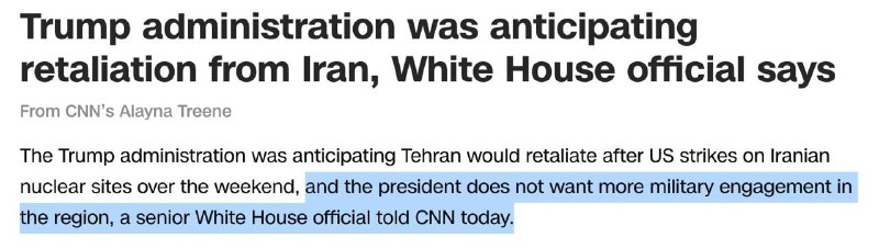 🇺🇸🇮🇷🇮🇱Trump does not want further military involvement in the Middle East, a senior White House official told CNN after Iran’s strikes on a US military base in Qatar.