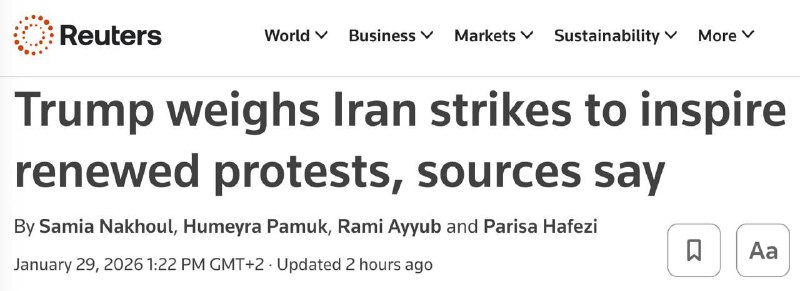 🇺🇸🇮🇷Trump is considering launching targeted strikes against the leadership and security forces of Iran to inspire protesters to seize government buildings, Reuters reports, citing sources.