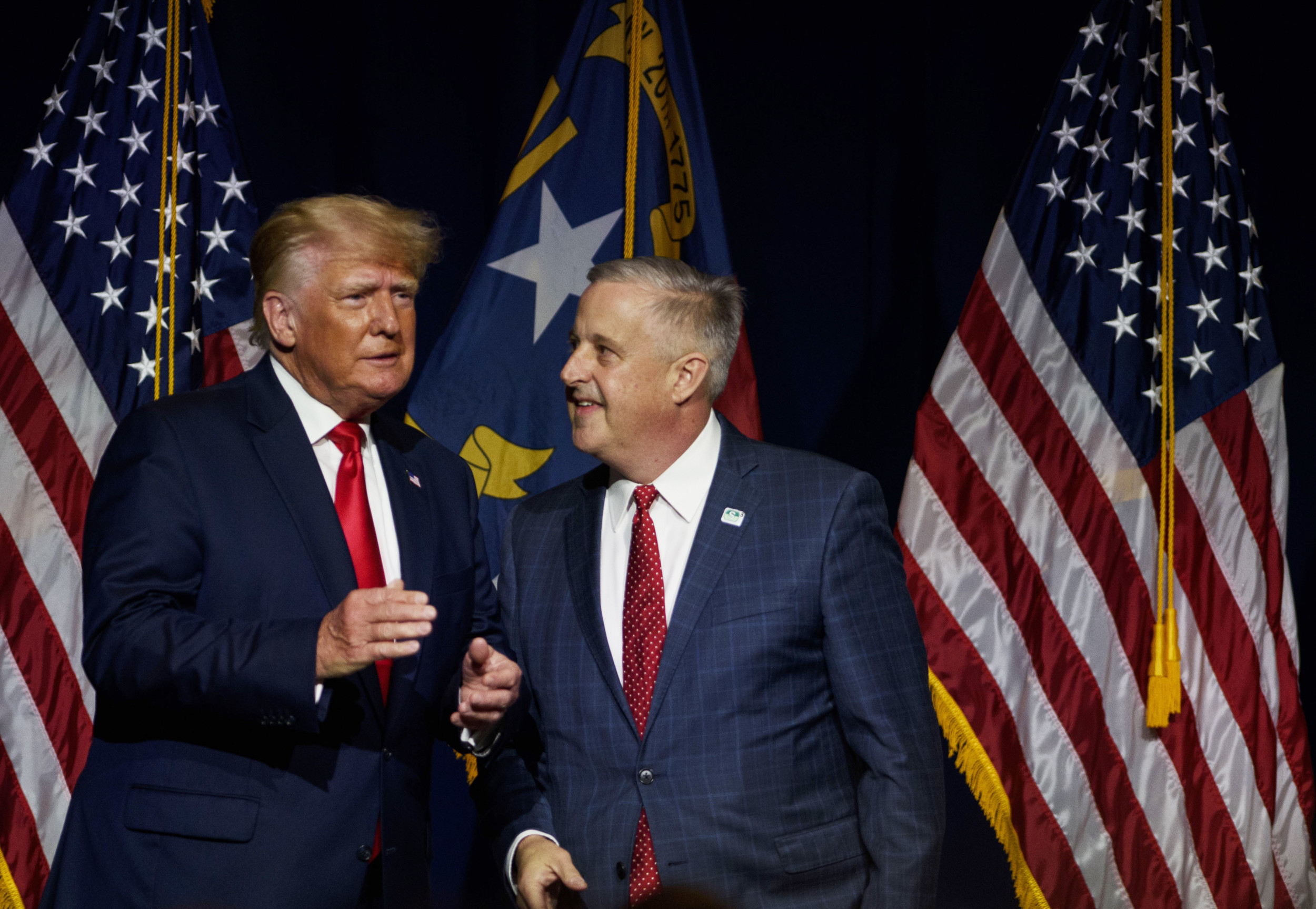 Former President Donald Trump takes the stage with Michael Whatley on June 5, 2021, in Greenville, North Carolina. Whatley lumped in Ukraine with China and Iran when listing the United States’ “aggressive” adversaries on Fox…