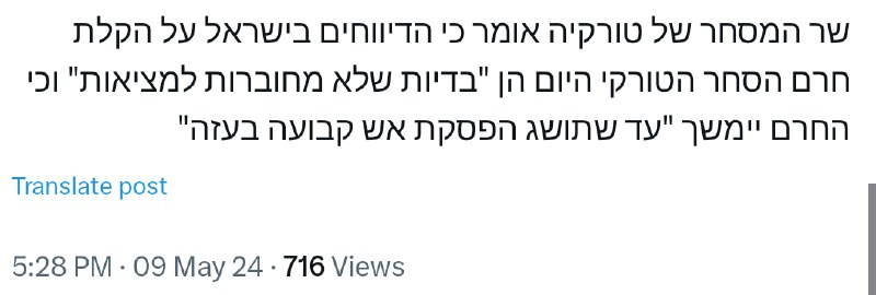 🇹🇷🇮🇱Turkey’s Trade Minister says reports of Turkey easing trade restrictions on Israel are fiction and sanctions will continue until a permanent cease-fire is reached in Gaza.