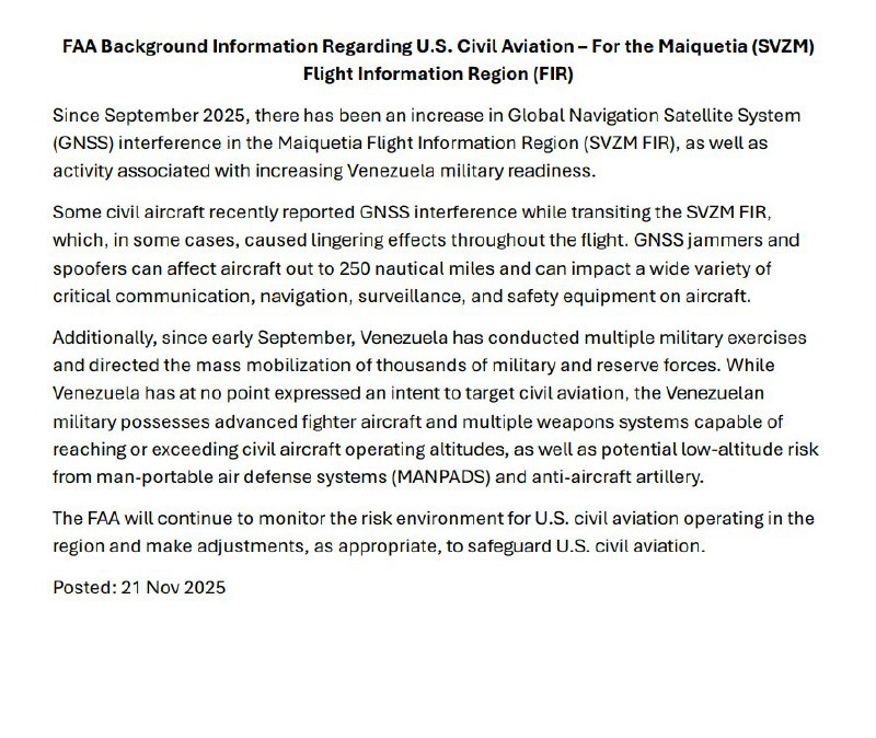 🇺🇸❌🇻🇪 — United States’ Federal Aviation Administration (FAA) has released a NOTAM for the Maiquetía Flight Information Region (FIR) for the “worsening security situation and heightened military activity in or around Venezuela” potentially being a threat to…