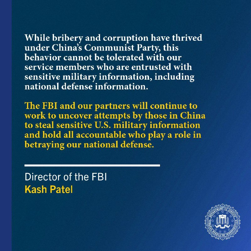 🇺🇸❌🇨🇳❗️— US FBI and United States Department of Justice arrested US Army 1st Lt. Li Tian and Sgt. Jian Zhao from Joint Base Lewis-McChord, along with former soldier Ruoyo Duan. They are accused of selling classified military secrets to Operatives of Communist China MSS/Chinese Communist Party