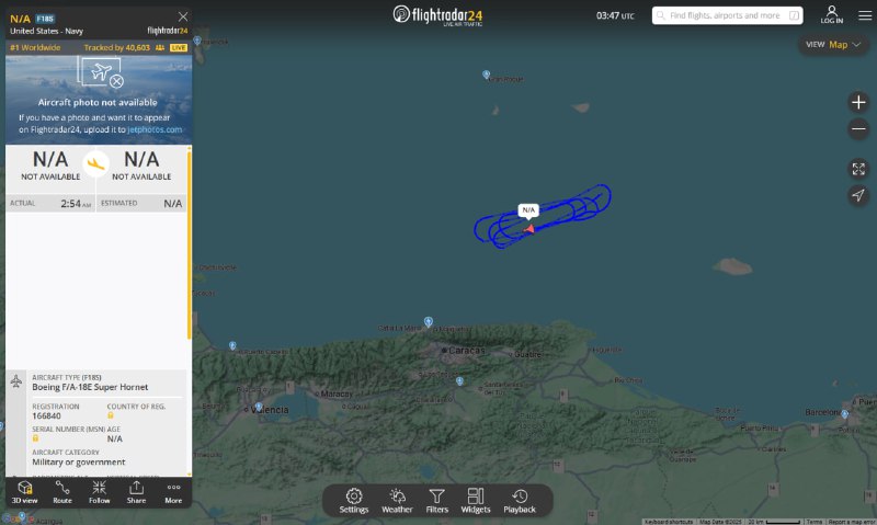 🇺🇸🪖🗺 — US Navy Boeing F/A-18E Super Hornet flying VERY close to Caracas, capital as now, far into the Venezuelan EEZ and near the coast of La Guaira View Source