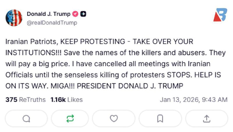 🇺🇸🇮🇷 – US President Trump says that he has canceled his meetings with Iranian officials and calls on Iranian protesters to keep protesting.