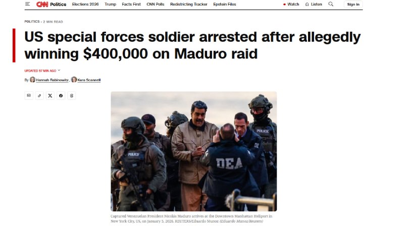 🇺🇸🔒📝 — US special forces soldier arrested after allegedly winning $400,000 on Maduro raid, CNN says
